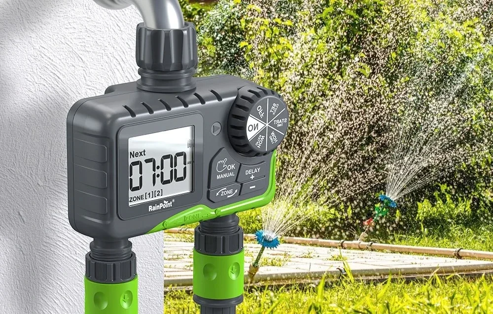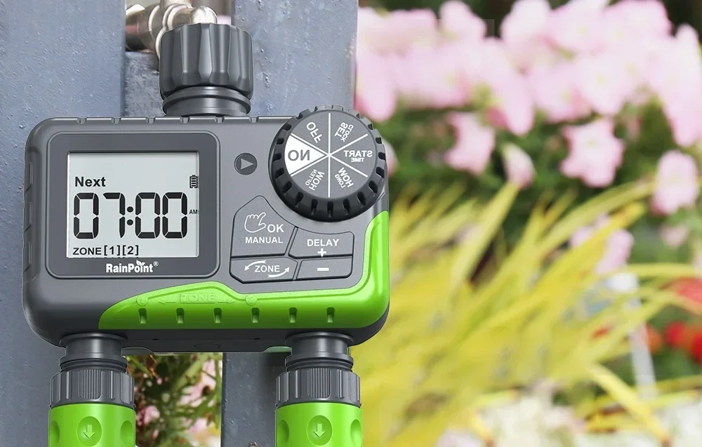 Le programmateur d’arrosage RainPoint ITV205 permet d’automatiser facilement l’irrigation de votre jardin directement depuis un robinet extérieur. Grâce à ses deux sorties indépendantes, il peut gérer simultanément deux zones d’arrosage avec des réglages différents, idéal pour arroser une pelouse et un potager avec des besoins distincts.